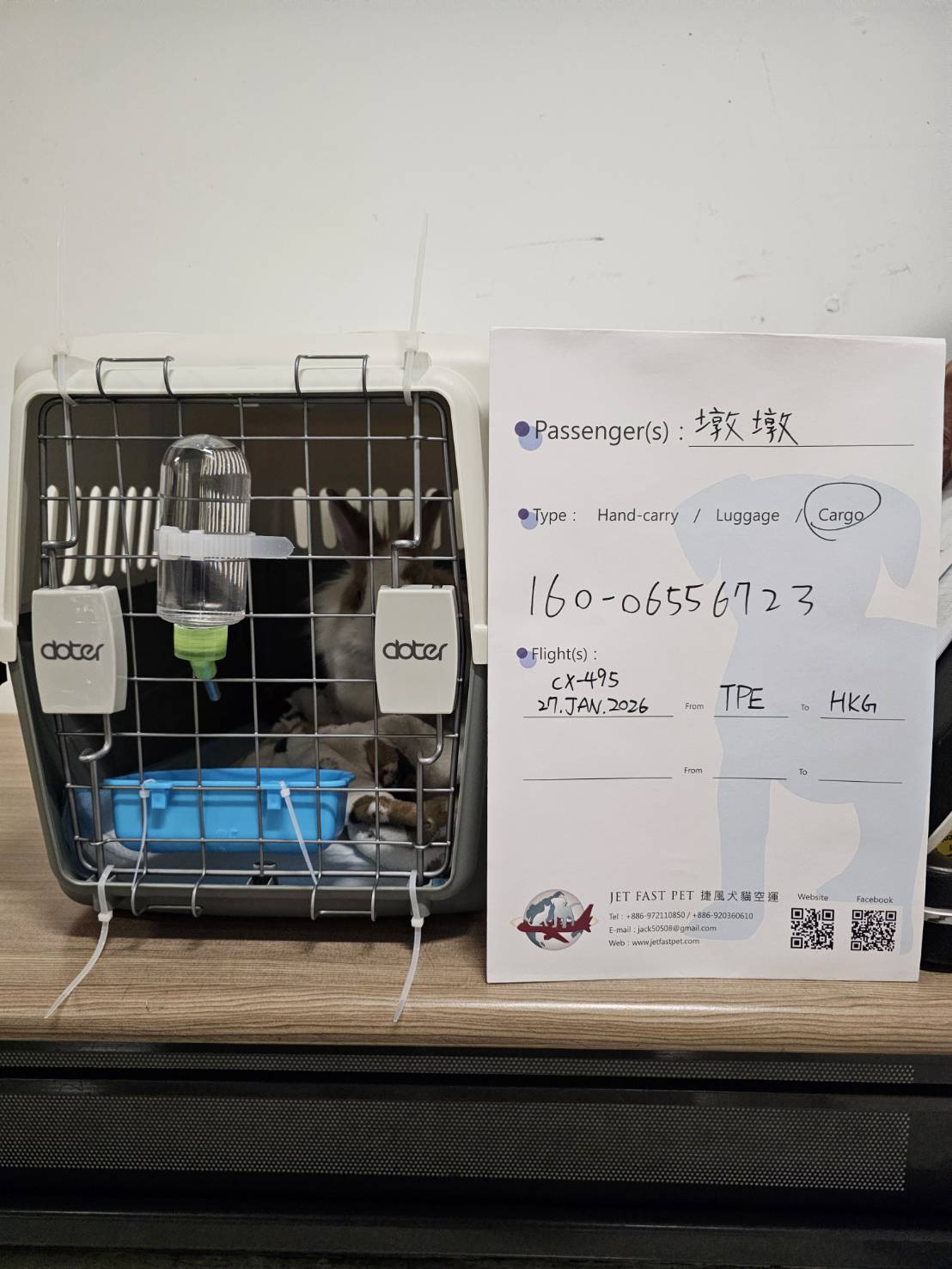 首頁 寵物出國 小兔兔墩墩,台灣飛往香港 小兔兔墩墩,台灣飛往香港2026 年 1 月 27 日寵物出國, 香港、中國大陸、澳門 啟程國家 Origin抵達國家 Destination此行目的 Purpose 台灣 Taiwan, TPE香港 Hong Kong, HKG移民 Immigration 旅客 Passengers 墩墩