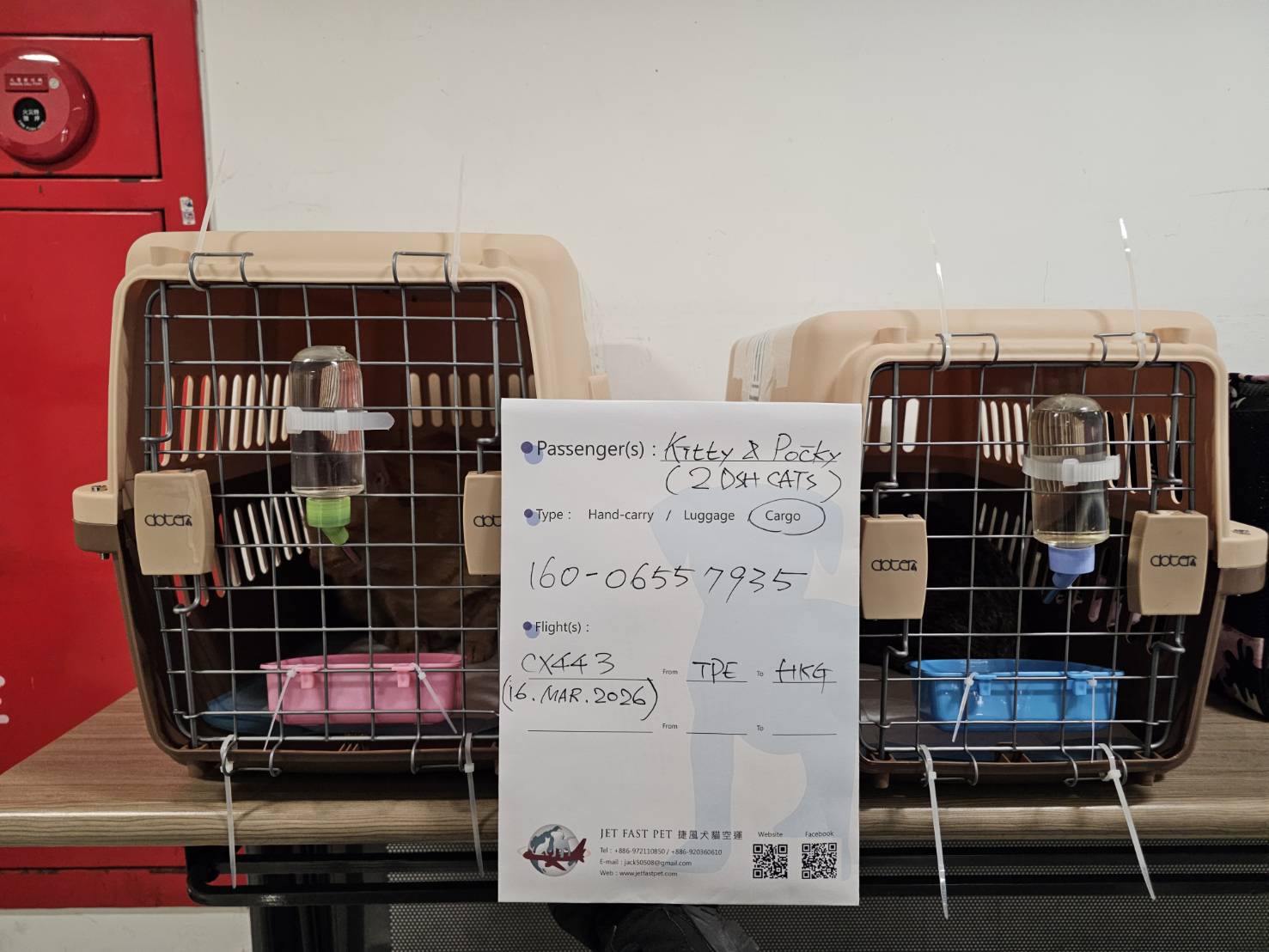 首頁 寵物出國 米克斯貓Kitty&Pocky,台灣飛往香港 米克斯貓Kitty&Pocky,台灣飛往香港2026 年 3 月 16 日寵物出國, 香港、中國大陸、澳門 啟程國家 Origin抵達國家 Destination此行目的 Purpose 台灣 Taiwan, TPE香港 Hong Kong, HKG移民 Immigration 旅客 Passengers KittyPocky